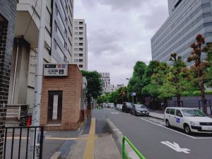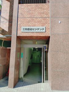 右隣の茶色いビルが当院が入っている三田慶応ビジデンスです。